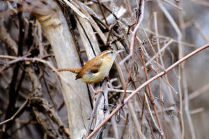 As I was walking through the riverside trails today, I heard the call of a bird that I don’t think I’ve heard (or at least paid attention to) before. I quickly scanned the area for any movement. Shortly after starting my search, I saw this little guy twisting back and forth with every other call he made. A quick look through my book helped me successfully identify this northern adult, male Carolina Wren (Thryothorus ludovicianus). According to my book, there is also a Mexican version that appears to have some additional dark patterning around its supercilium (the area just above the eyes) and toward the rear end of the flank (the feathers down the bird’s side).